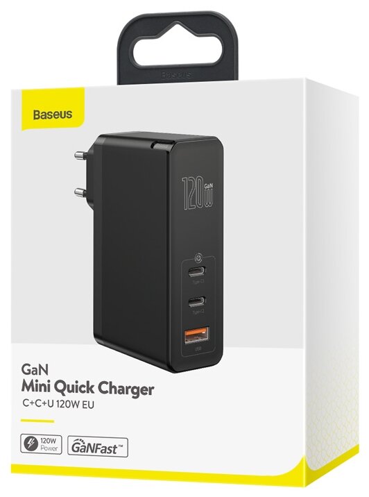 Сетевое зарядное устройство Baseus GaN Mini Quick Charger C+C+U + кабель Type-C-Type-C, 120 Вт, черный