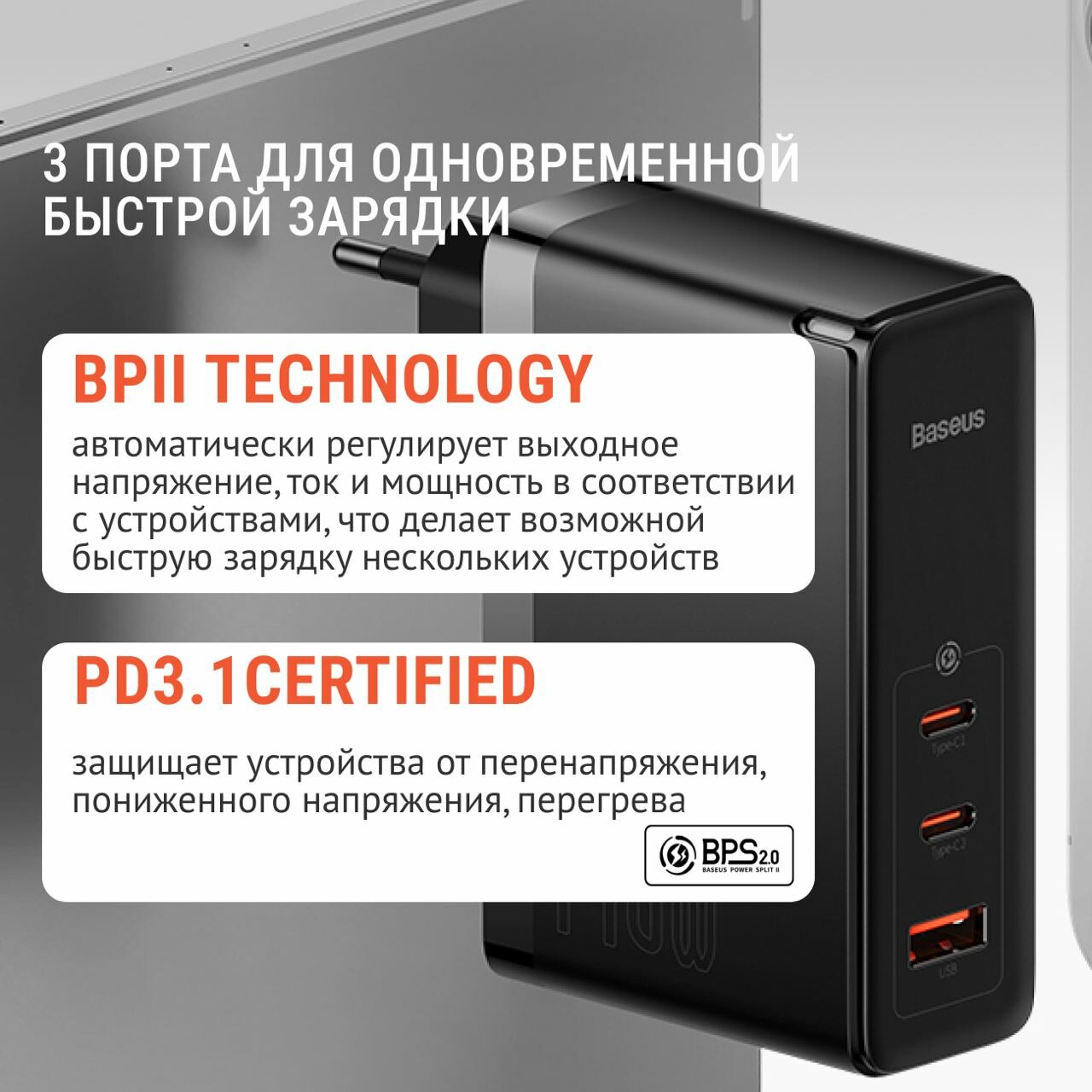 Мощное зарядное устройство U + (2х)C, Baseus Fast Charger, 65W, GaN 5 Pro, черное