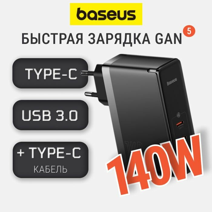 Купить Сетевое зарядное устройство/Быстрая зарядка Baseus GaN5 Pro Fast Charger 2C+U 140W EU Black Cable Type-C to Type-C CCGP100201