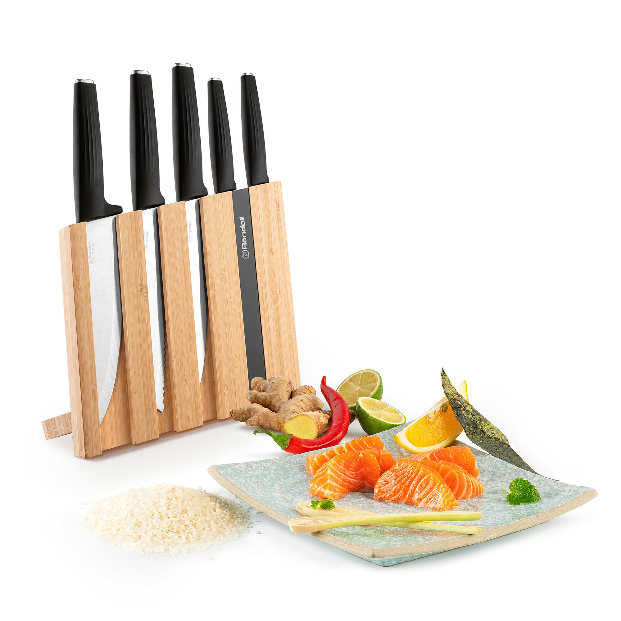 | Комплектация | поварской нож 20см, разделочный нож 20 см, нож для хлеба 20 см, универсальный нож 12,7см, нож для чистки овощей 9см, вертикальная подставка из бамбукового дерева |