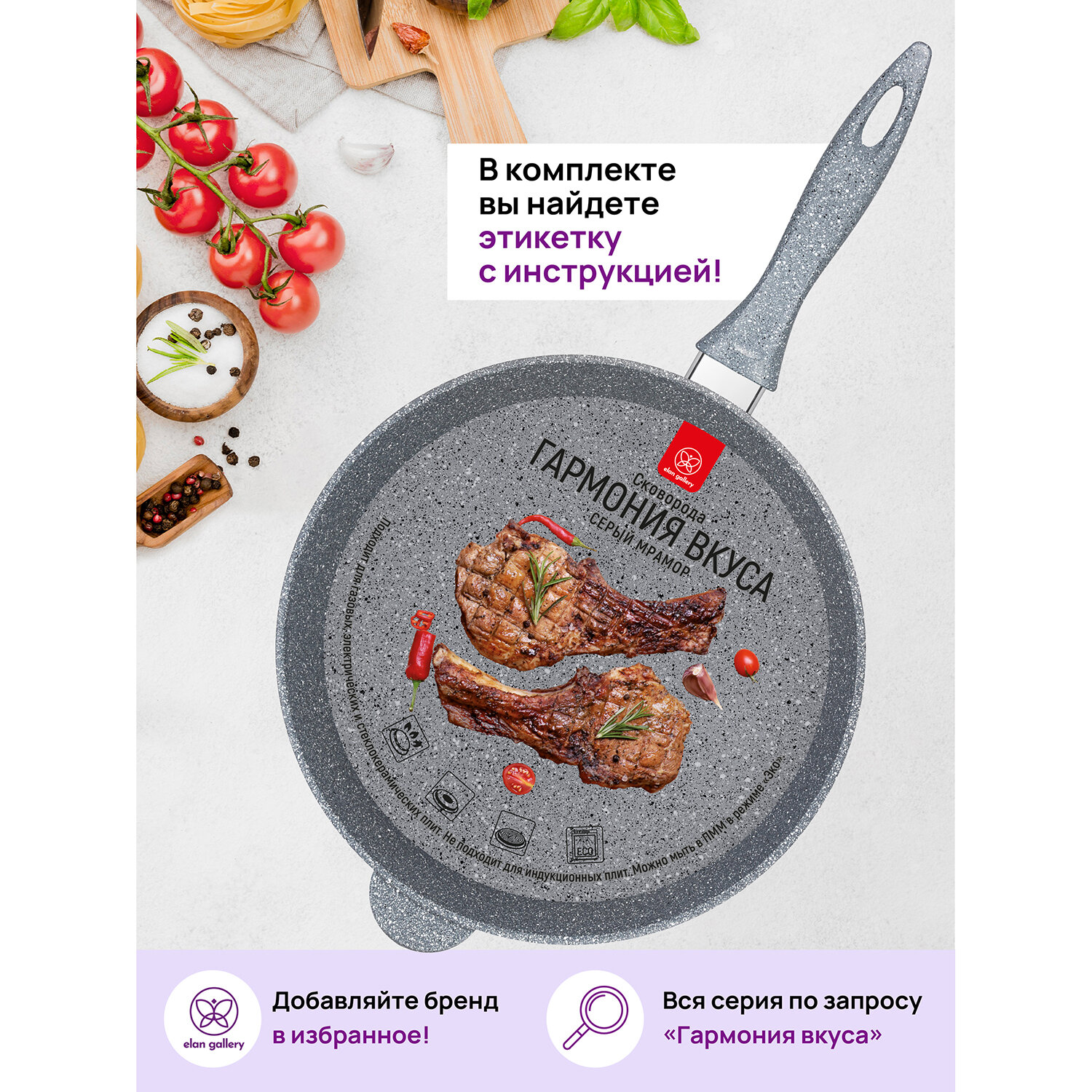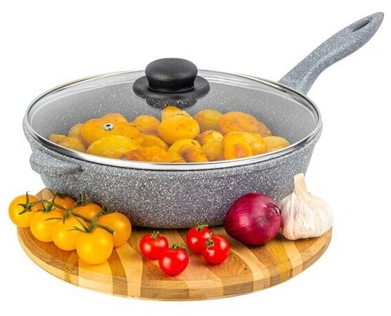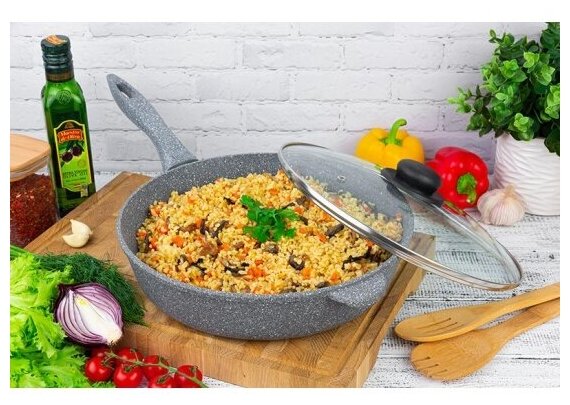 Сковорода глубокая 28 см Elan Gallery гармония вкуса Серый мрамор с крышкой D28, несъёмная ручка интересное: