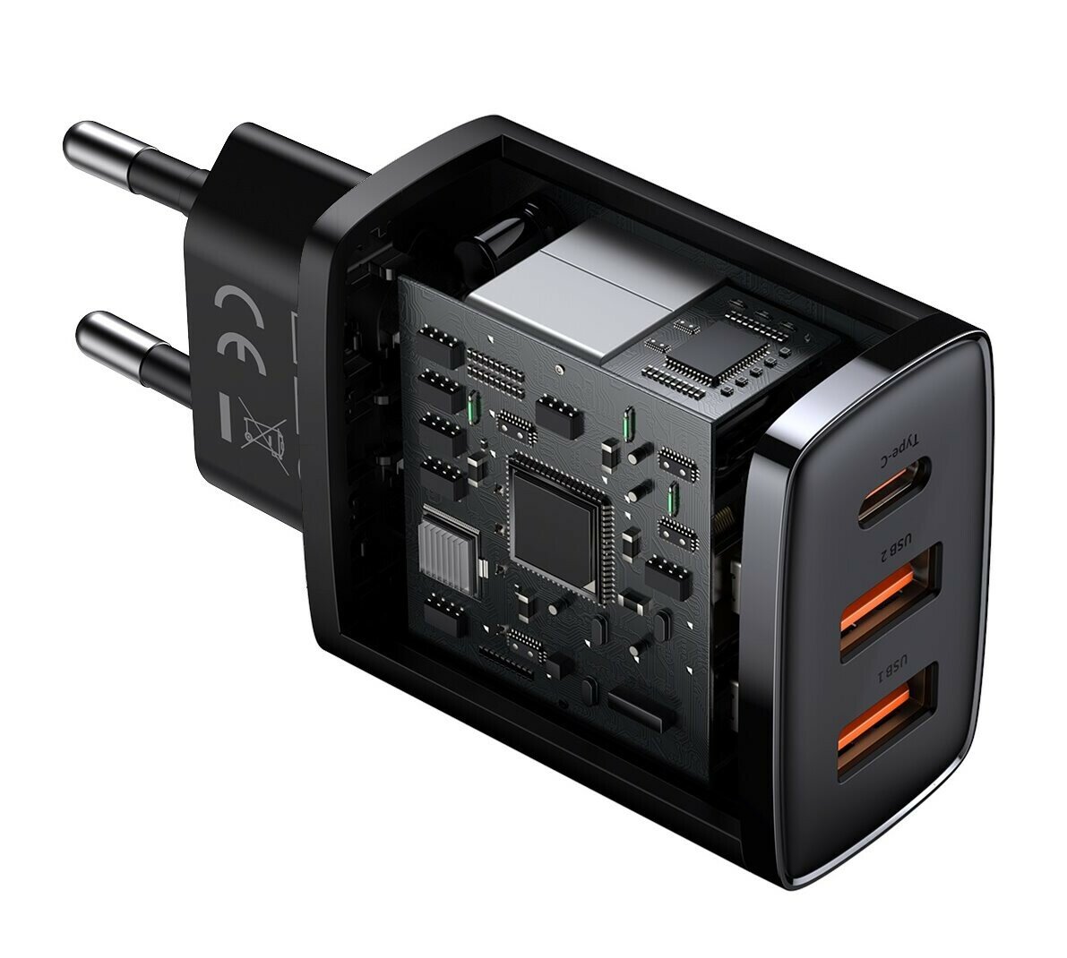 Зарядное устройство Baseus Compact Quick Charger 2*USB+USB-C, 3A, 30W, черный