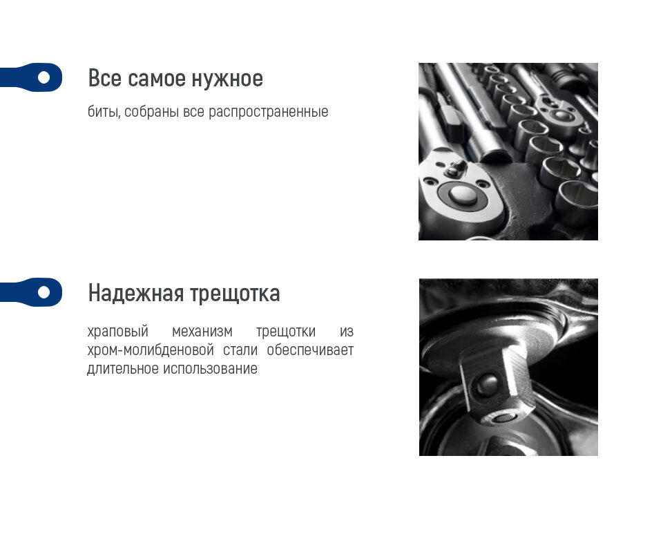 | Дополнительная информация | рукоятка реверсивная 1/4” (трещотка) 155 мм. с функцией быстрого сброса, храповый механизм с 24 зубьями, рабочий угол 15° - 1 шт.; удлинитель 1/4”: 50 мм., 75 мм. - 2 шт.; шарнир универсальный 1/4” - 1 шт.; рукоятка - битодержатель 1/4” 150 мм. - 1 шт.; вороток Т-образный 1/4” - 1 шт.; рукоятка реверсивная 1/2” (трещотка) 250 мм. с функцией быстрого сброса, храповый механизм с 24 зубьями, рабочий угол 15° - 1 шт.; удлинитель 1/2”: 120 мм. - 1 шт.; шарнир универсальный 1/2” - 1 шт.; адаптер для бит 1/2”- 5/16” - 1 шт.; вороток Т-образный 1/2” с удлинителем 250 мм. - 1 компл. |