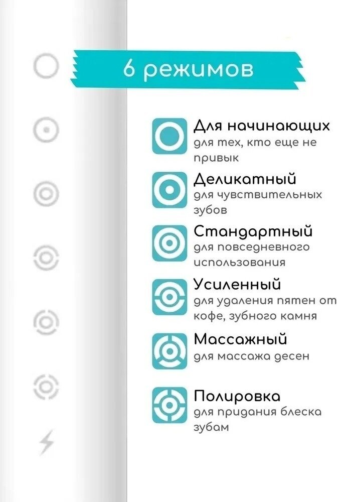 | Режимы работы | деликатная чистка / ежедневная чистка / отбеливание / уход за деснами |
