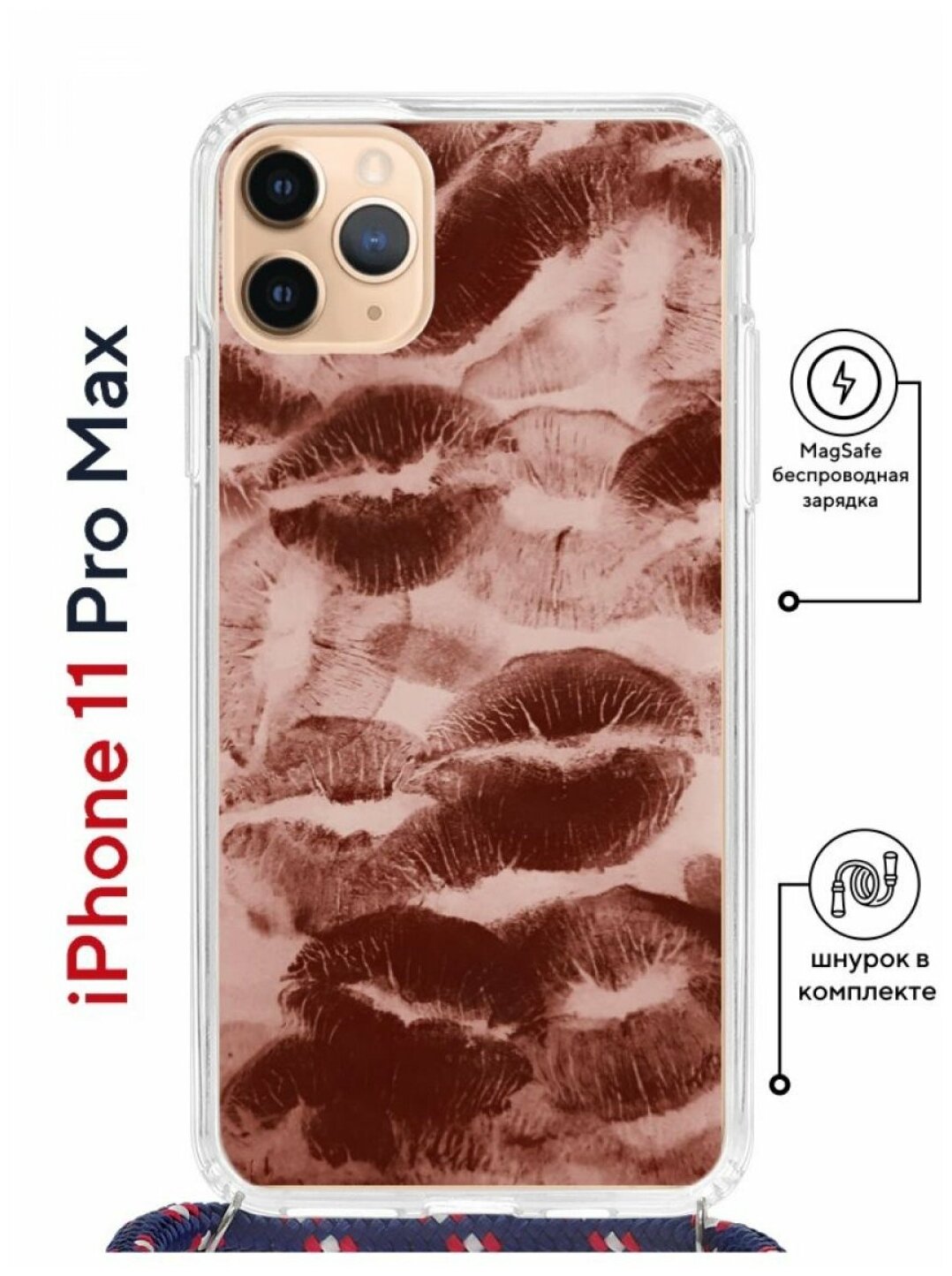 Чехол для iPhone 11 Pro Max Kruche Print MagSafe Magrope Kisses,противоударная пластиковая накладка,защитный силиконовый бампер со шнурком интересное: