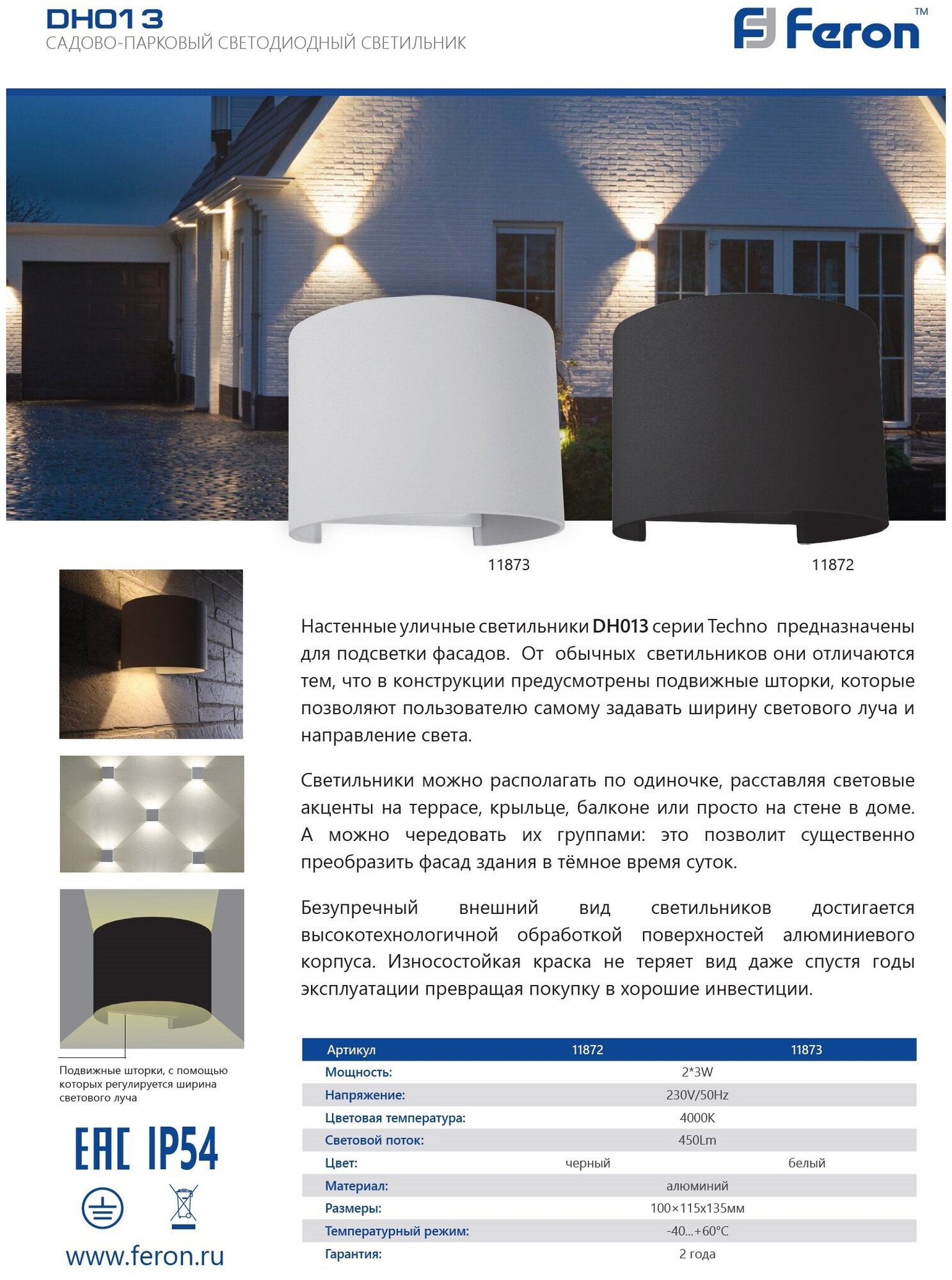 Светильник уличный светодиодный, 2*3W, 450Lm, 4000K, DH013, белый