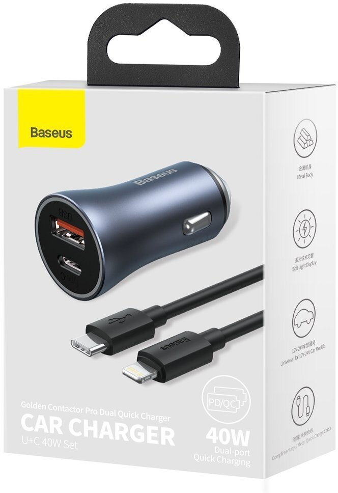 Купить Автомобильное зарядное устройство Baseus Golden Contactor Pro Dual Quick Charger Car Charger U+C 40W Dark Gray (With Baseus Simple Wisdom Data Cable Type-C to Lightning 1m Black) (TZCCJD-B0G)