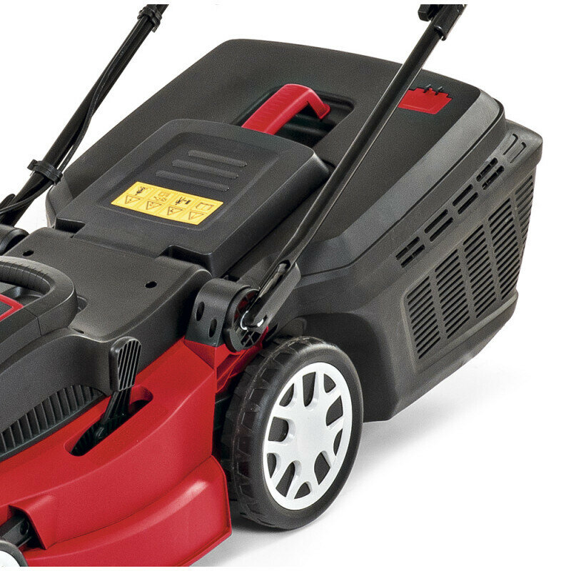 Лёгкая Маневренная Недорогая (сравнительно) Прочный нож Удобная ручка (можно любой рукой работать и перехватываться не выключая) Крупные колёса Давно фирма на рынке, у людей по много лет работает (надёжная, вроде бы) Безщёточный асинхронный двигатель (более дорогой, но более надёжный и устойчивый к пиковым нагрузкам, поэтому превосходит даже более мощные по кВт обычные аналоги) Центральная регулировка высоты (один рычаг с "гребёнкой") Высота стрижки 25-85 мм Крепкий пластик Хороший внешний вид Удобный держатель для провода Комфортные децибелы (работать приятно, не орёт) Ширина покоса 42 см Плотно набивает траву в травосборник (не приходится полупустой носить) Не забивается травой канал и место ножа, всё в травосборник улетает. Информативный клапан наполнения травосборника (как упал - пора вытряхивать) Насадка для мульчирования в комплекте Жесткий пластиковый короб на 47 л. |