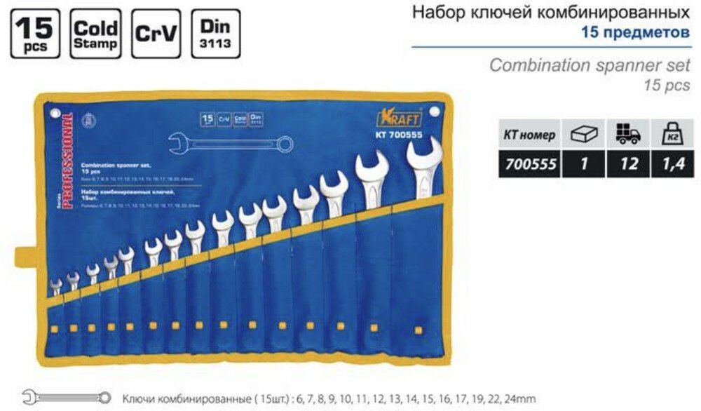 Набор комбинированных ключей 15шт: 6-17,19,22,24мм (сумка), KRAFT KT 700555
