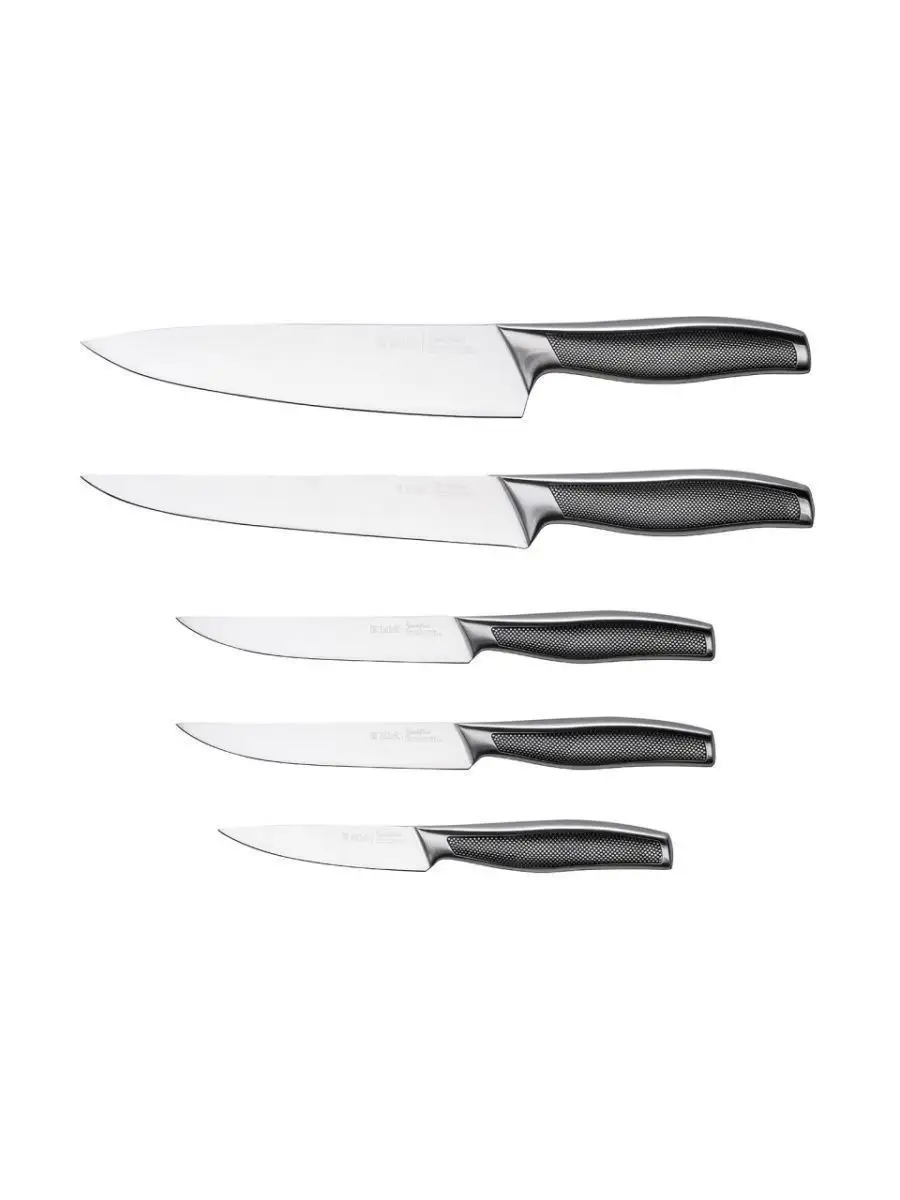 | Комплектация | - нож поварской, лезвие 20,5 см х 2,5 мм; - нож для нарезки, лезвие 21 см х 2,5 мм; - нож универсальный, лезвие 13,5 см х 2 мм, 2 шт.; - нож для чистки, лезвие 10 см х 2 мм; - подставка |
