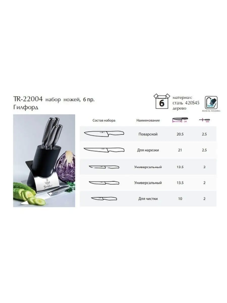 | Дополнительная информация | лезвия ножей из твердой коррозионностойкой стали AISI 420S45 (3Cr13), ручки из легированной стали 420S45, подставка из каучукового дерева и нержавеющей стали |