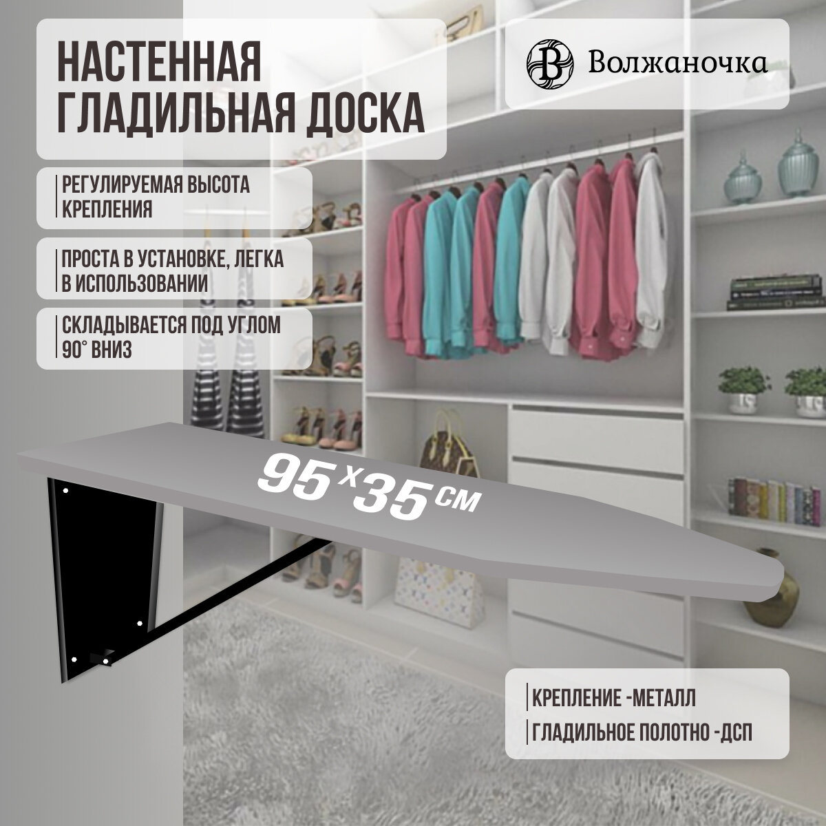 Волжаночка Гладильная доска настенная, размер столешницы 95х35см., цвет серый кварц