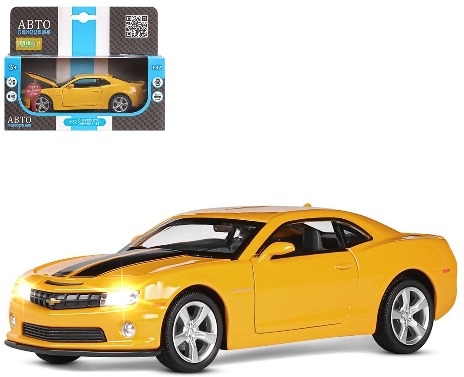 Модель машины инерционная Автопанорама 1:32 Chevrolet Camaro SS, желтый, свет, звук, открываются двери (JB1251155)