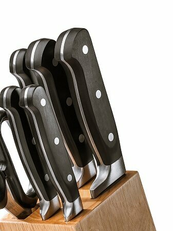 | Комплектация | - нож поварской, лезвие 20 см х 2,5 мм; - нож для нарезки, лезвие 20 см х 2,5 мм; - нож обвалочный, лезвие 15 см х 2,5 мм; - нож универсальный, лезвие 12,5 см х 2 мм; - нож для чистки, лезвие 9 см х 2 мм; - ножницы 25 см; - подставка |