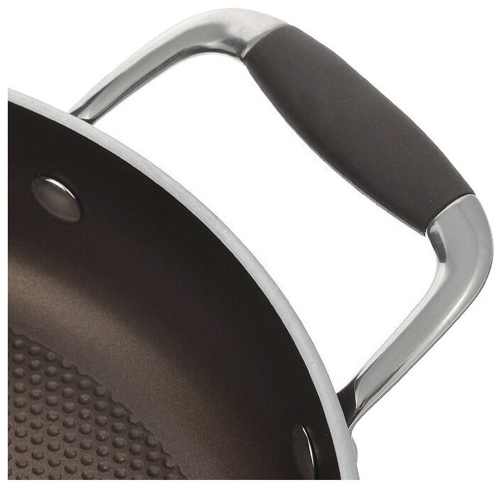 Очень удобный. Крышка с силиконовой окантовкой, силиконовые вставки на ручках. Отличное покрытие. |