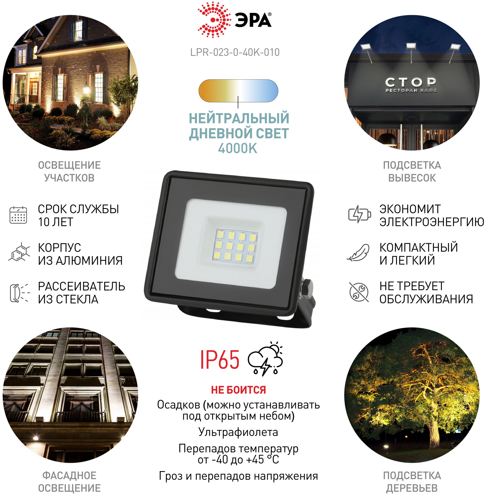 ЭРА LPR-023-0-40K-010 Фонарь ЭРА прожектор светодиодный LPR-023-0-40K-010 яркий холодный 10Вт/220В