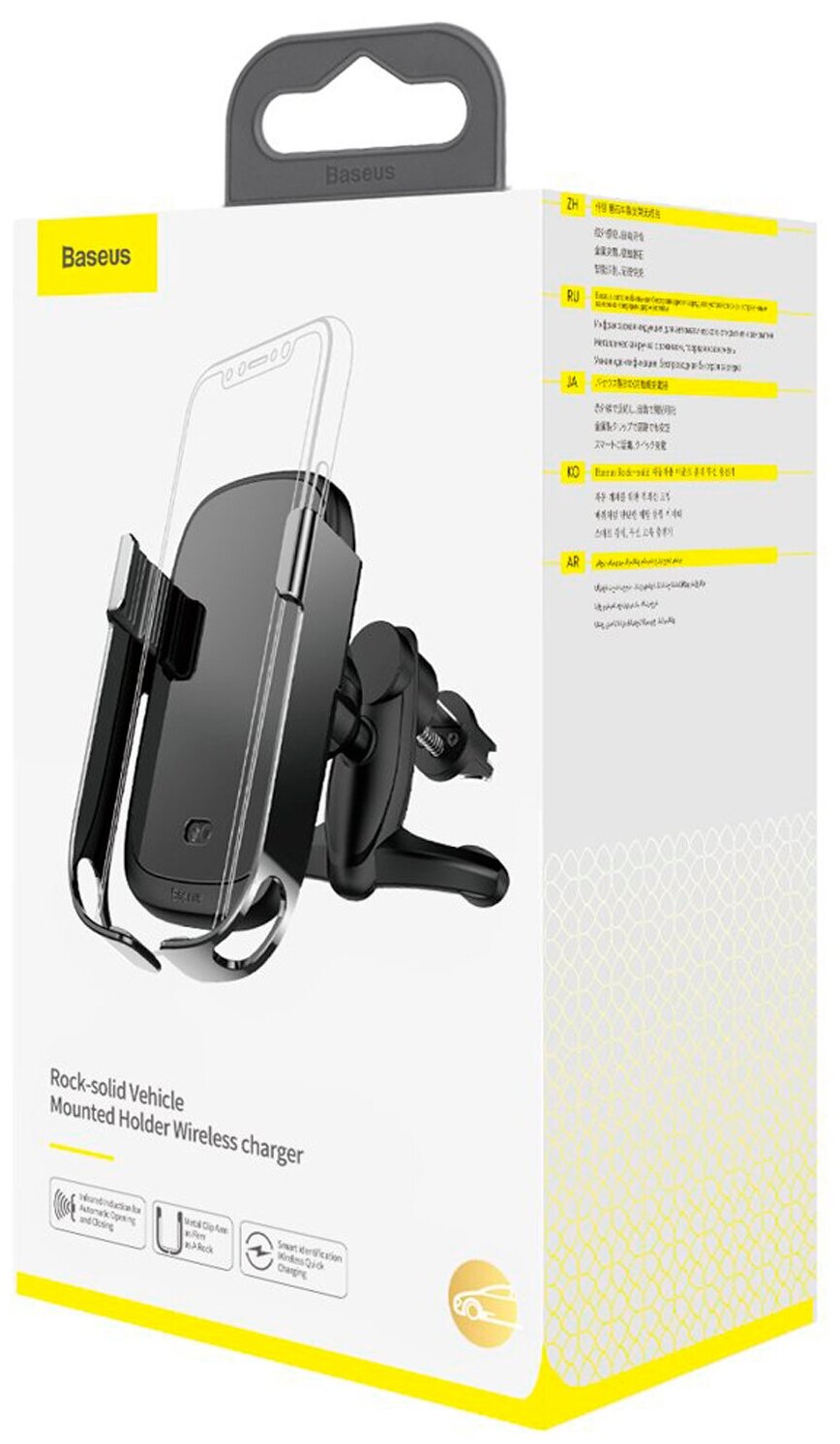 Автомобильный держатель BASEUS Rock-solid, с беспроводной зарядкой, 2A, 10W, 4.5"- 6.5", черный, на воздуховод, индикатор, WXHW01-01