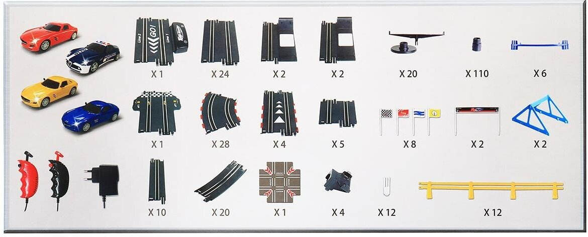 | Комплектация | трек, 4 машинки по лицензии Mercedes и Alfa Romeo, 2 пульта управления, блок питания, инструкция |