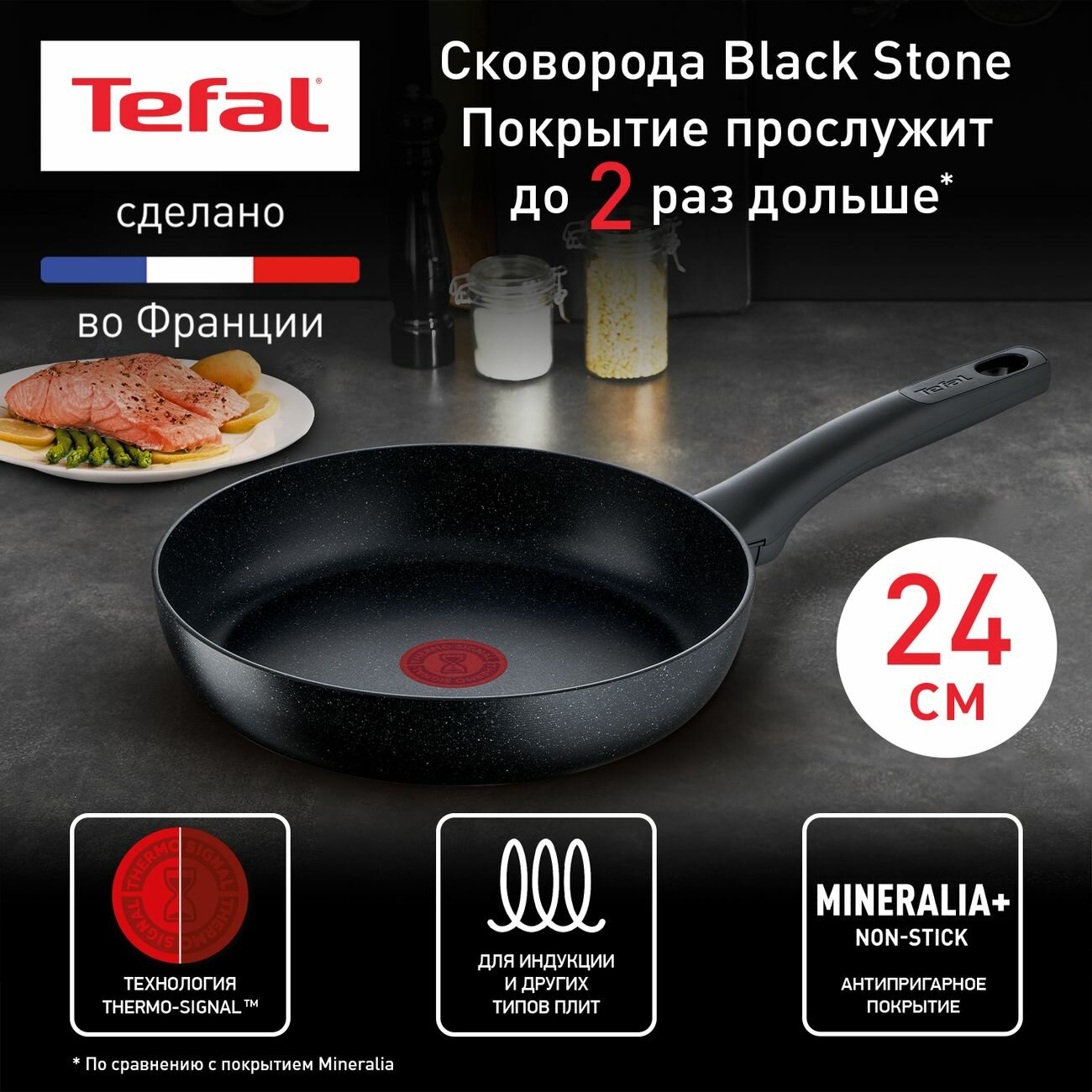Сковорода Tefal Black Stone G2810472, алюминий, антипригарное покрытие, 24см