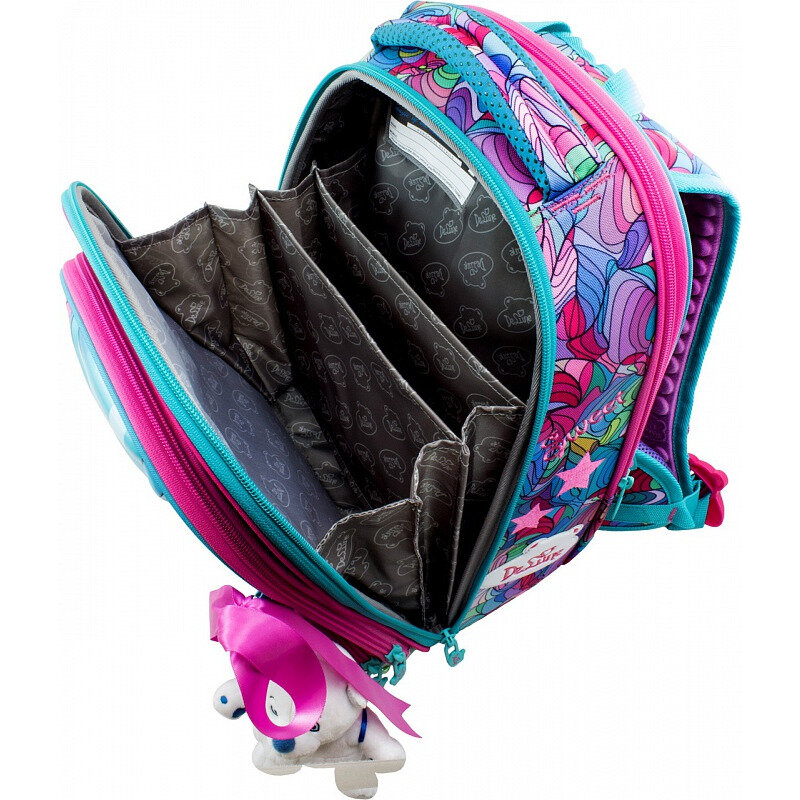 | Комплектация | - ранец; - каркасный пенал / повторяющий дизайн ранца; - мешок для сменной обуви / декорированный под ранец / с сеточкой для циркуляции воздуха; - бирка с индивидуальным штрих кодом и описанием; - мягкая игрушка-мишка ( герой DeLune ); - атласная ленточка для волос (для девочки). |