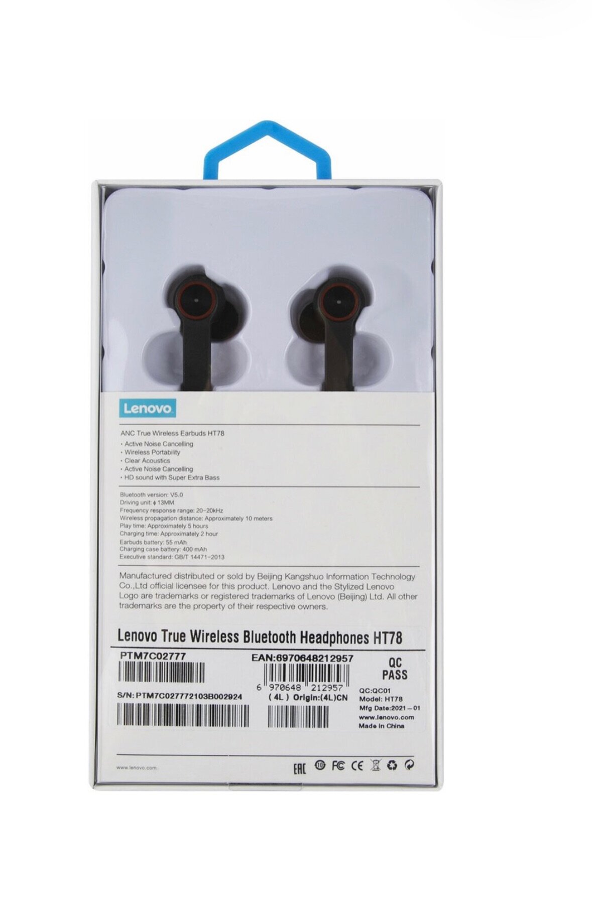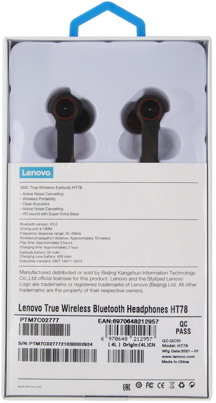 Наушники Lenovo HT78 с микрофоном и шумоподавлением (TWS), черные (PTM7C02777)