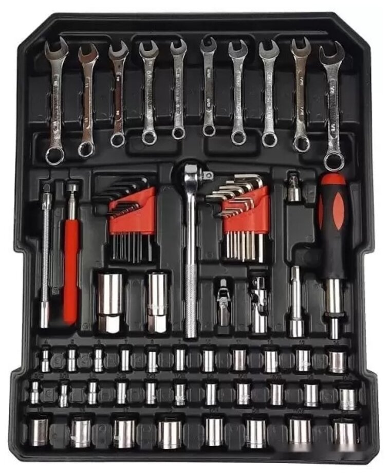 | Инструменты в комплекте | молоток / отвёртки / трещотка / пассатижи / длинногубцы / ключи гаечные / кусачки / клещи / отвёртки для точных работ / ключ разводной / ключи имбусовые (шестигранные) |