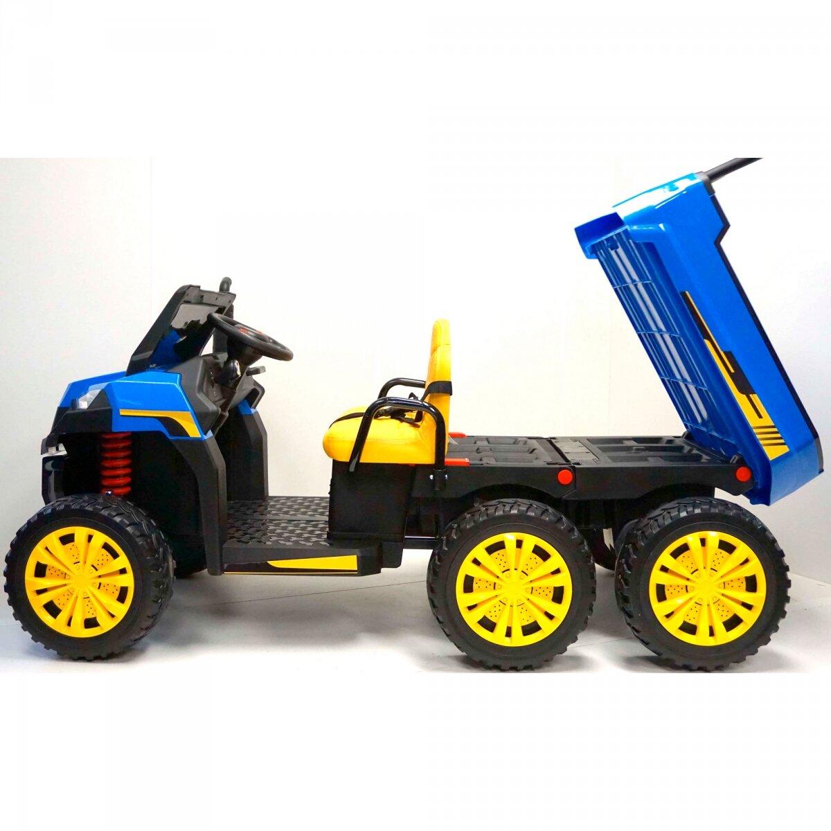 Задняя пружинная подвеска на 2-3 осях обеспечивает хороший контакт с дорогой. Заряда хватает на очень долго. Пружины подвески и моторы редукторов находятся в корпусе машины. |