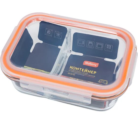 Контейнер Mallony Gusto, 600 мл, 2 секции из жаропрочного стекла с крышкой с защёлками 008676 .