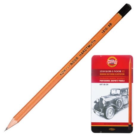 Карандаши чернографитные KOH-I-NOOR, набор 12 шт., Art, 8В-2H, без резинки, металлическая коробка, 1512N12001PL