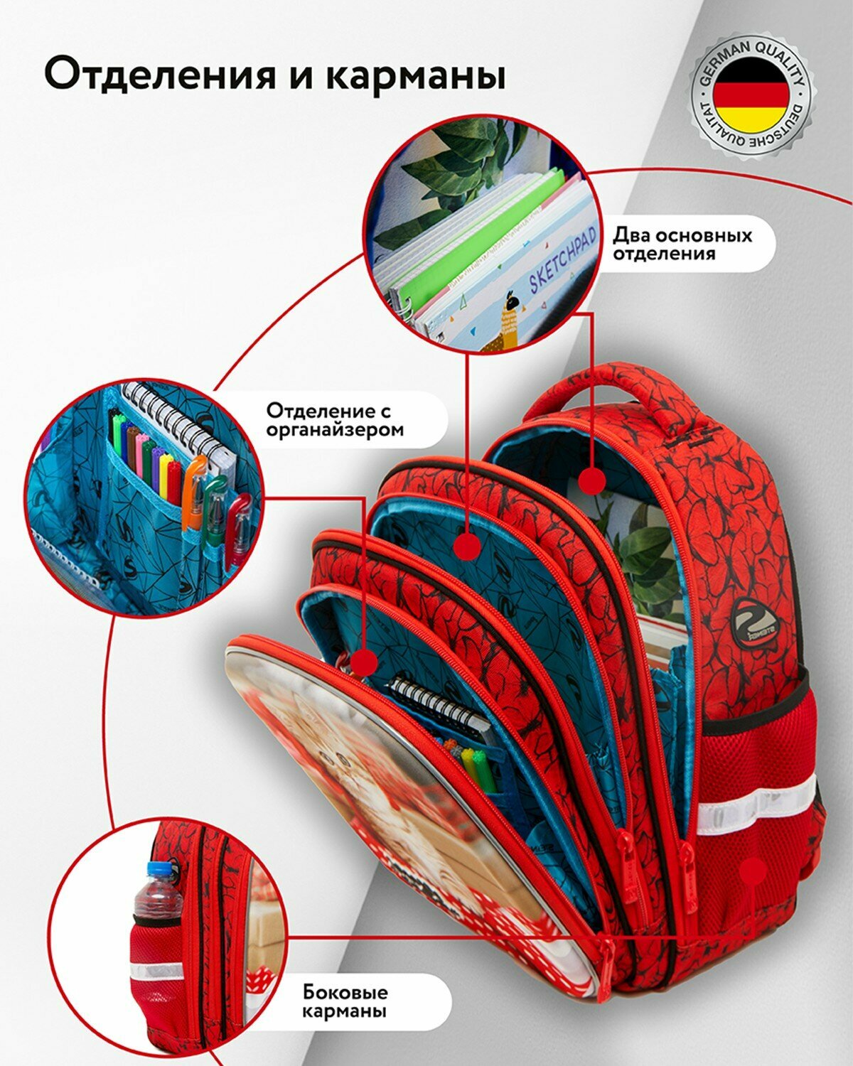 | Специальные отделения | внешние карманы / карман для телефона / отделение для ноутбука / карман для бутылки / отделения для ключей / отделение для зонта / органайзер / отделение для очков |