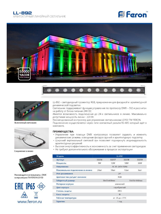 Светодиодный линейный прожектор с DMX Feron LL-892 36W RGB 24V IP65 fr_32259