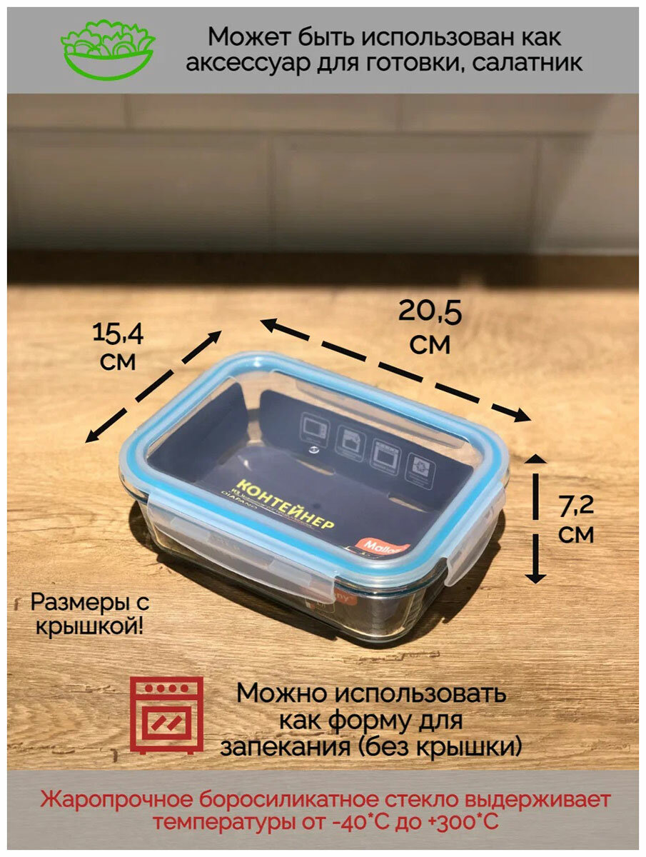 | Плюсы: | Отличный товар! Крышка прилегает плотно. Ставь хоть в духовку, хоть в свч. Легко моется, запах еды не впитывается в материал контейнера, как в пластик. Стекло толстое, надо постараться, чтобы разбить. |