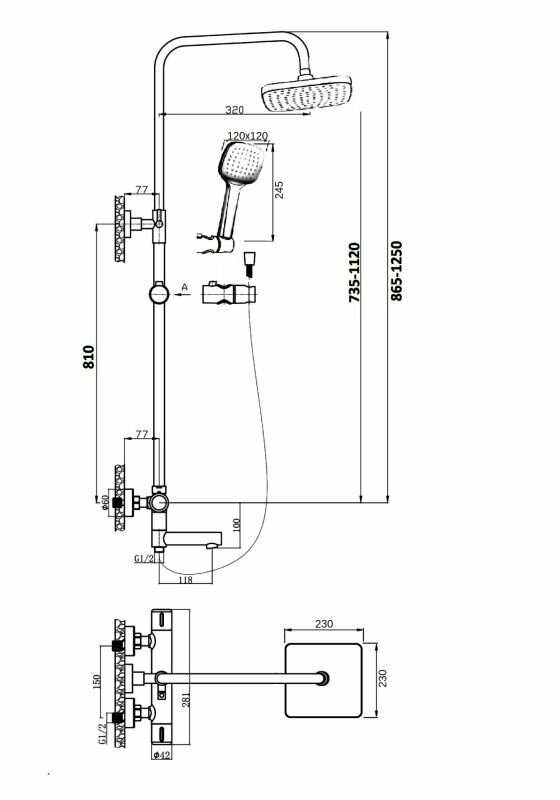 | Комплектация | верхний душ / шланг для душа / термостат с изливом / душевая лейка / душевая штанга / держатель лейки / держатель штанги / эксцентрики / инструкция |
