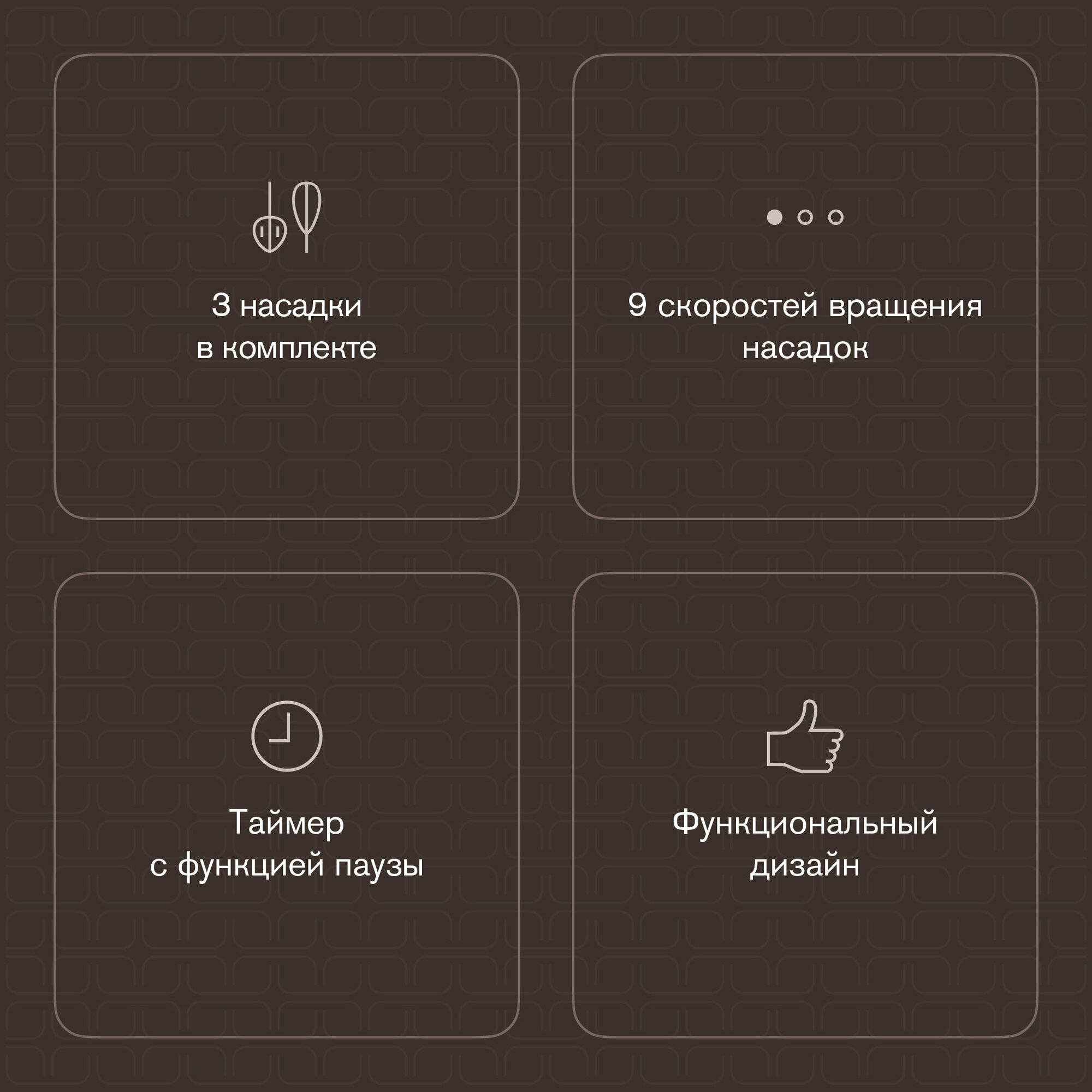 | Плюсы: | 9 скоростей вращения, led-подсветка, 3 типа насадок, удобное хранение |