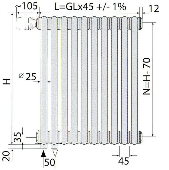Радиатор стальной вертикальный Arbonia 2180/06 N69 твв 2-х трубчатый, нижняя подводка, встроенный вентиль RAL 9016