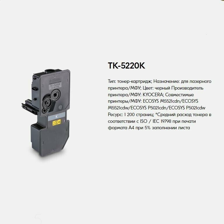 Тонер-картридж KYOCERA (TK-5220K) ECOSYS P5021cdn/cdw/M5521cdn/cdw, черный, ресурс 1200 стр., оригинальный, 1T02R90NL1