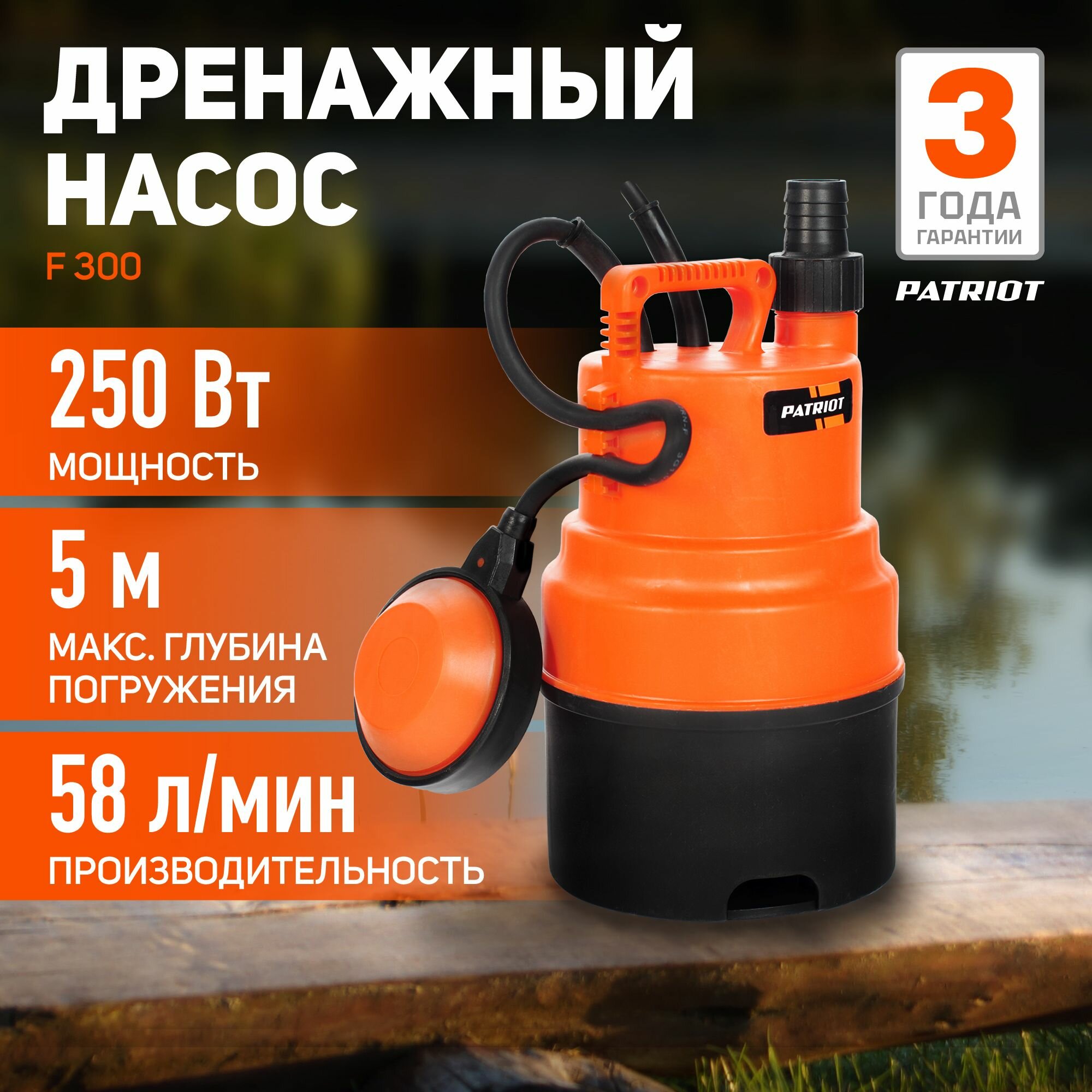 Насос дренажный PATRIOT F 300 для чистой воды, корпус - пластик, 250 Вт, 3500 л/час.