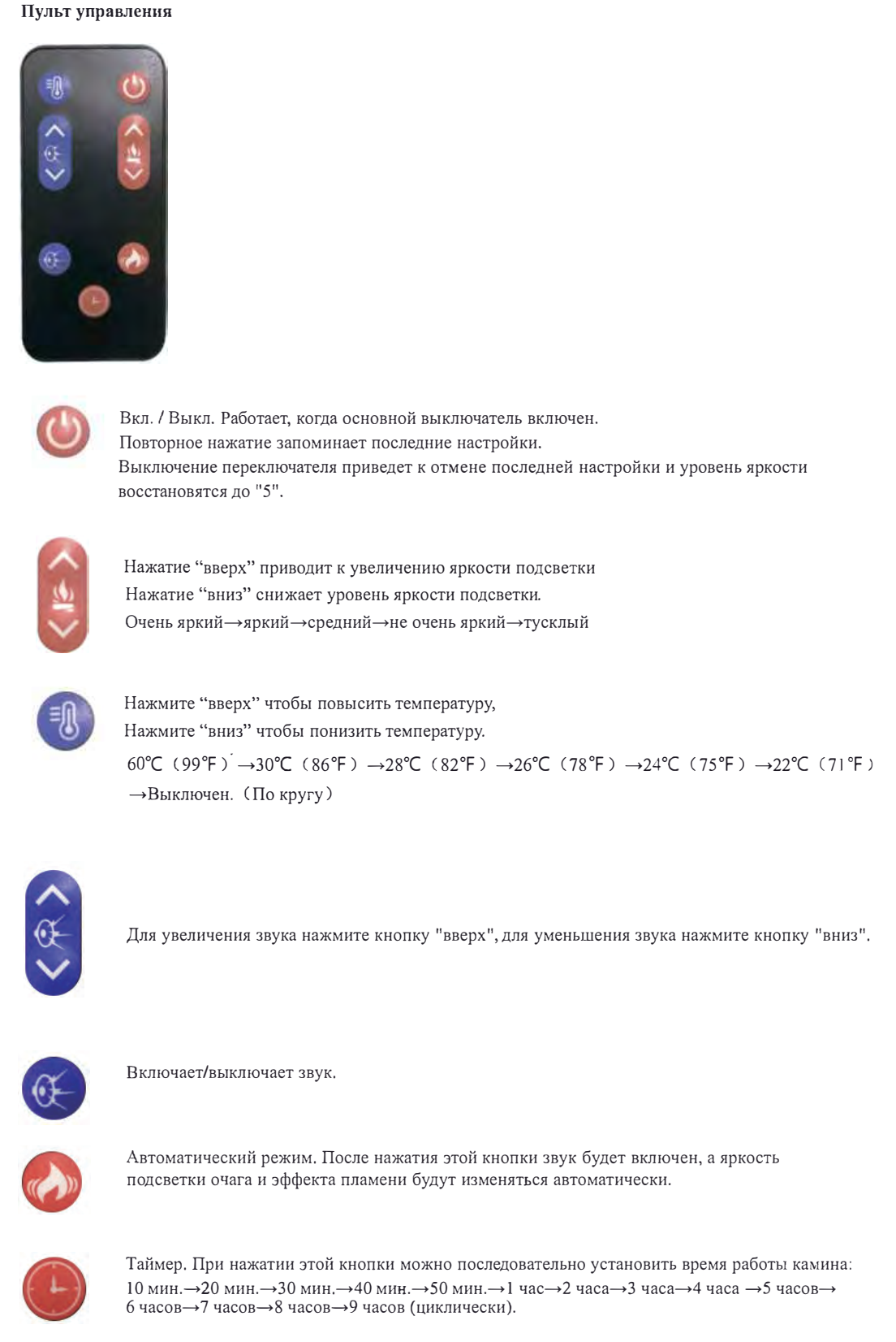 | Дополнительная информация | термостат; цифровой дисплей; регулировка яркости пламени - 5 ступеней; регулировка подсветки дров |