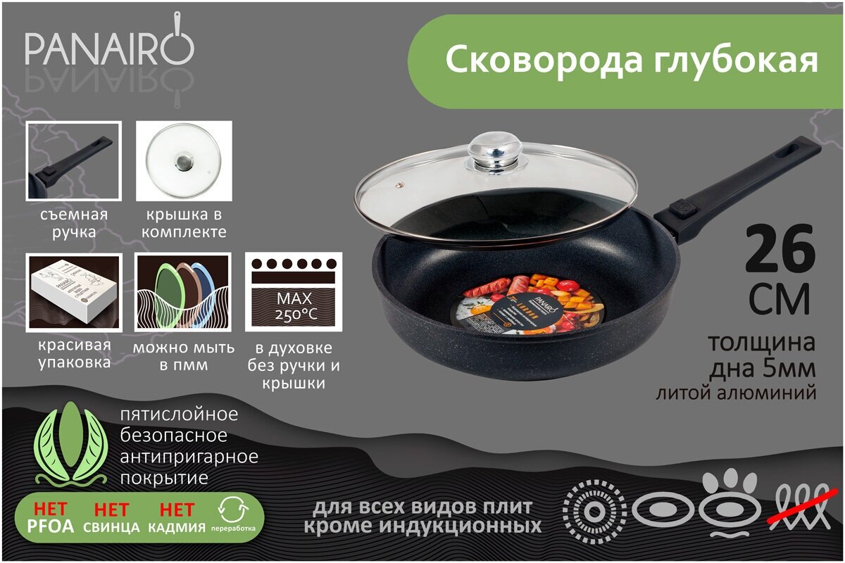 Сковорода глубокая с крышкой Panairo "Lordom", съемная ручка, 26 см
