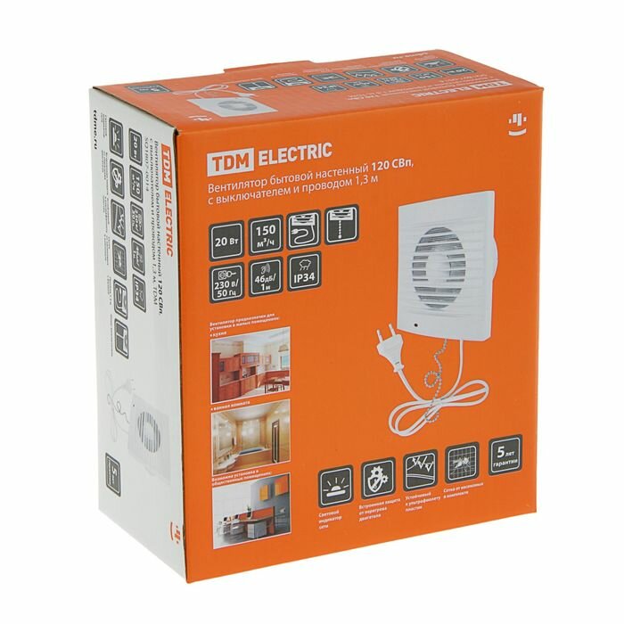 Вентилятор бытовой настенный 120 СВп, с выключателем и проводом 1,3 м, TDM (1 шт.)