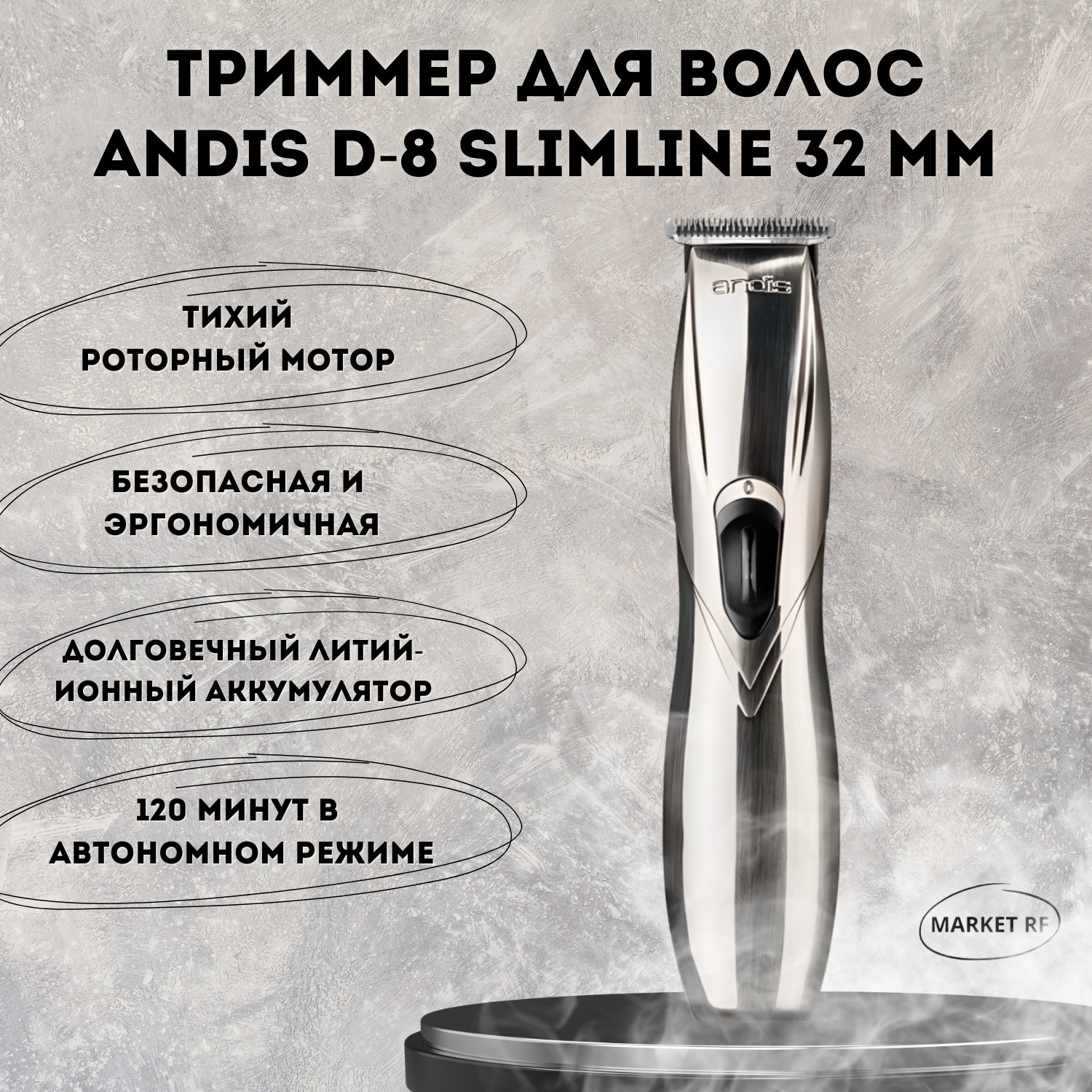 Триммер окантовочный Andis D/8 Slimline Pro, 0,1 мм, аккум/сетевой, 2,5 Вт, 4 насадки, серебристый