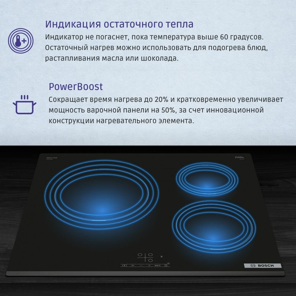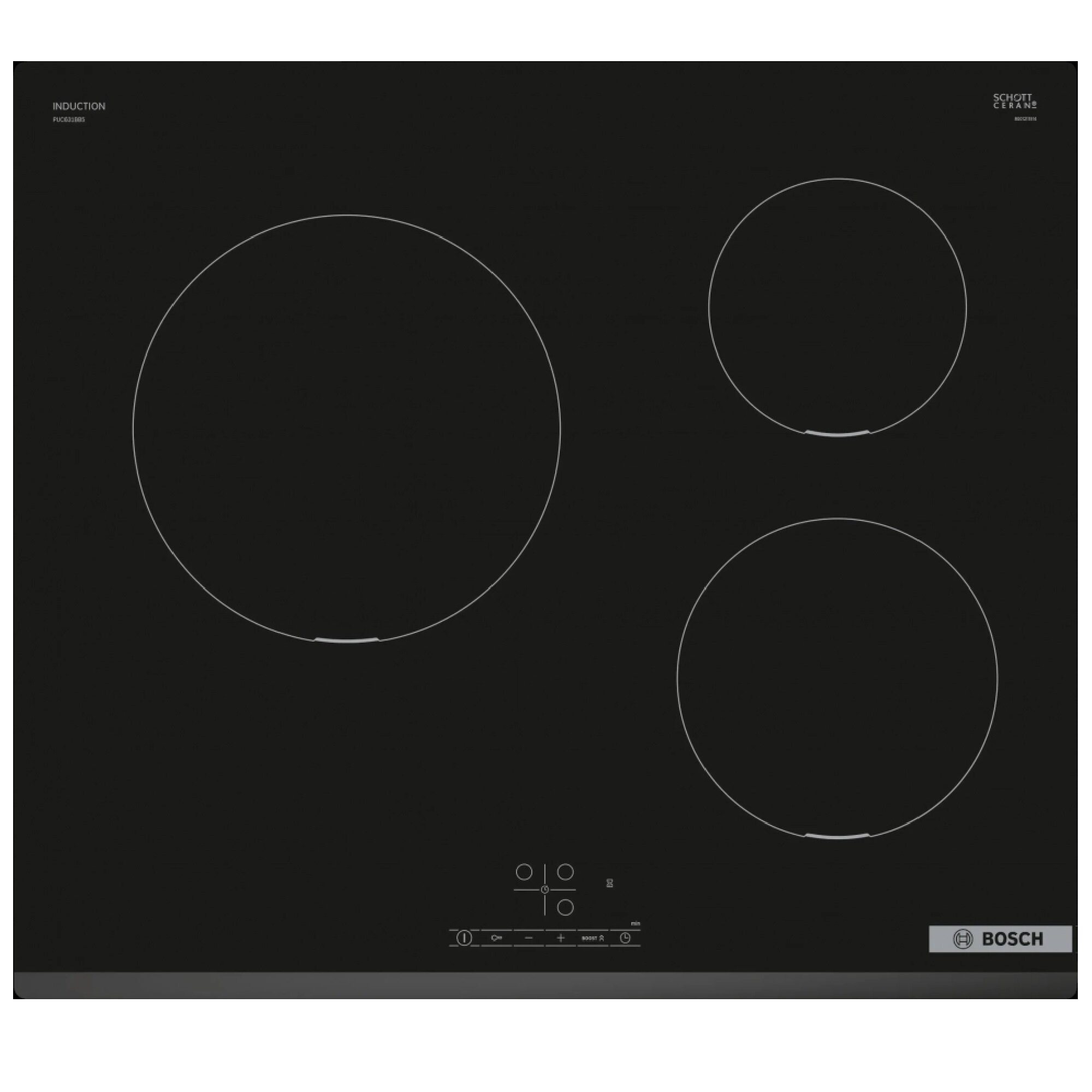 Встраиваемая индукционная варочная панель BOSCH PUC631BB5E Serie 2, 59.2 см, 3 зоны нагрева, TouchSelect, стеклокерамика, черный