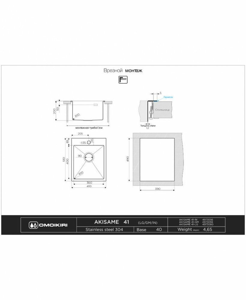 | Дополнительная информация | два варианта установки (врезной монтаж, монтаж вровень со столешницей), толщина металла 1.2 мм |