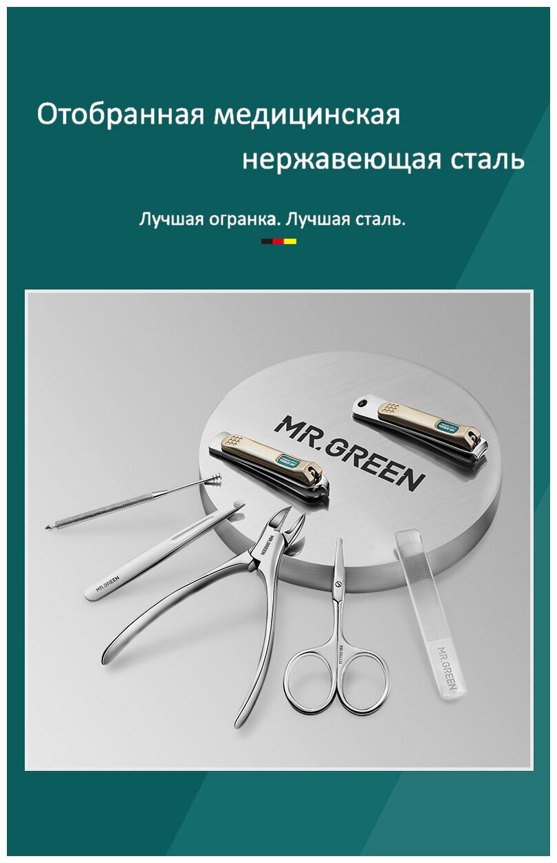 MR.GREEN Маникюрный набор из медицинской нержавеющей стали в кожаном футляре в дорогу из 4 предметов в подарочной упаковке интересное: