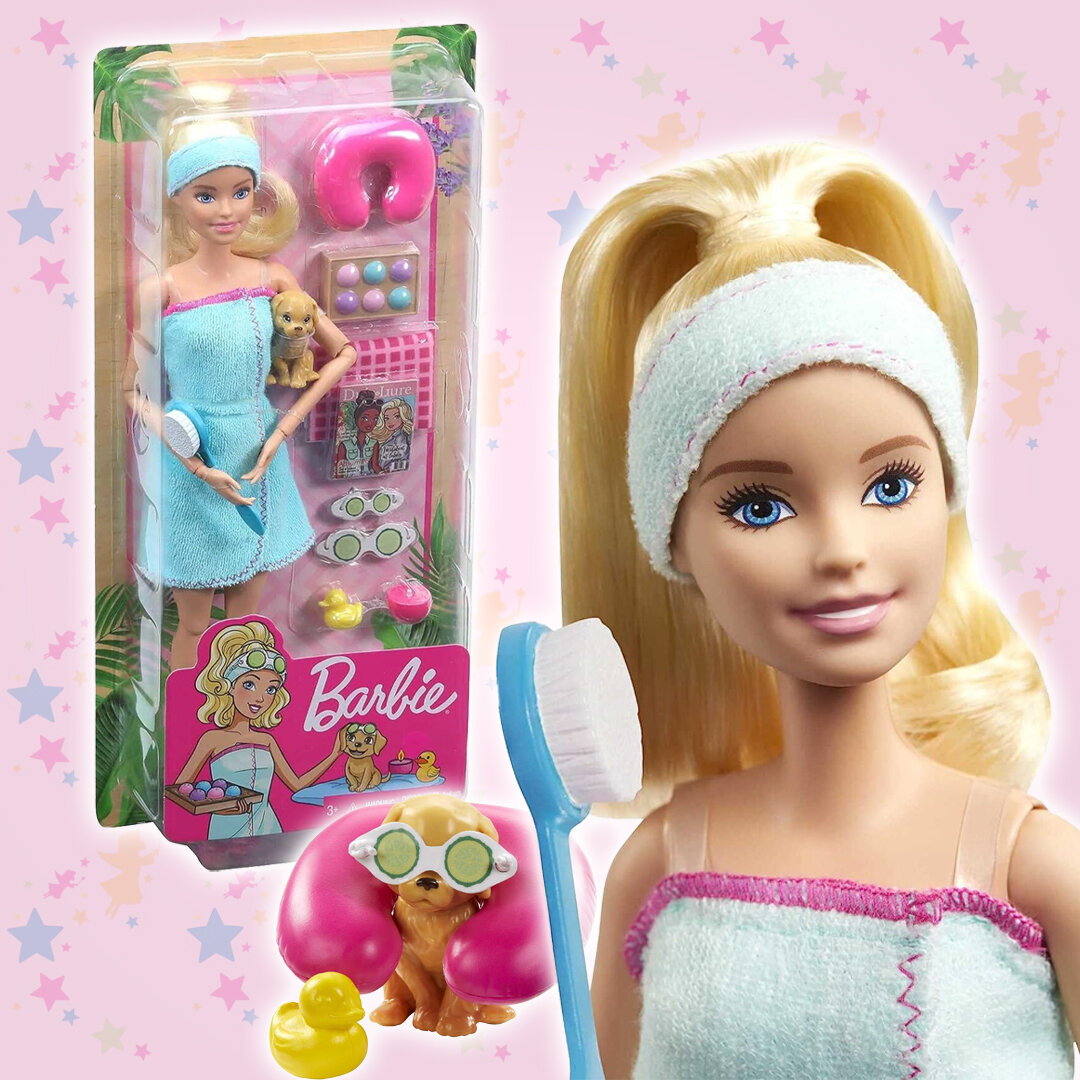 Кукла Barbie GJG55 Wellness Spa, блондинка, со щенком и 9 аксессуарами, включая подушку для шеи, резиновую уточку и маску для глаз в виде огурца, игрушка в подарок для детей от 3 до 7 лет