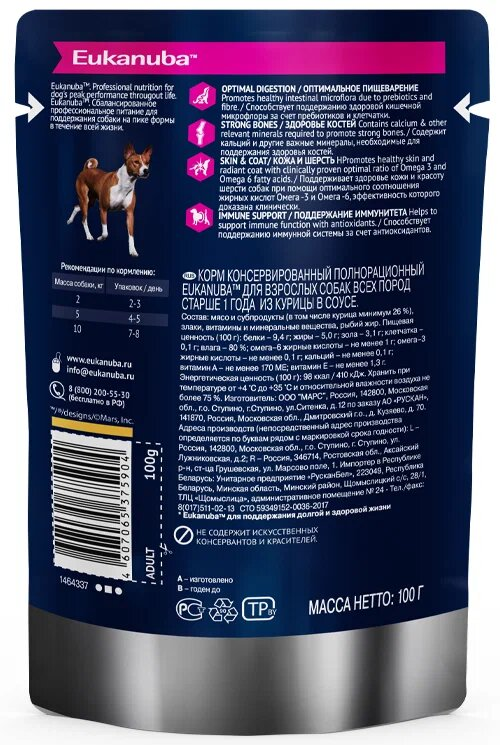 Влажный корм Eukanuba Adult Dog для собак с курицей в соусе в паучах - 100 г х 24 шт интересное:
