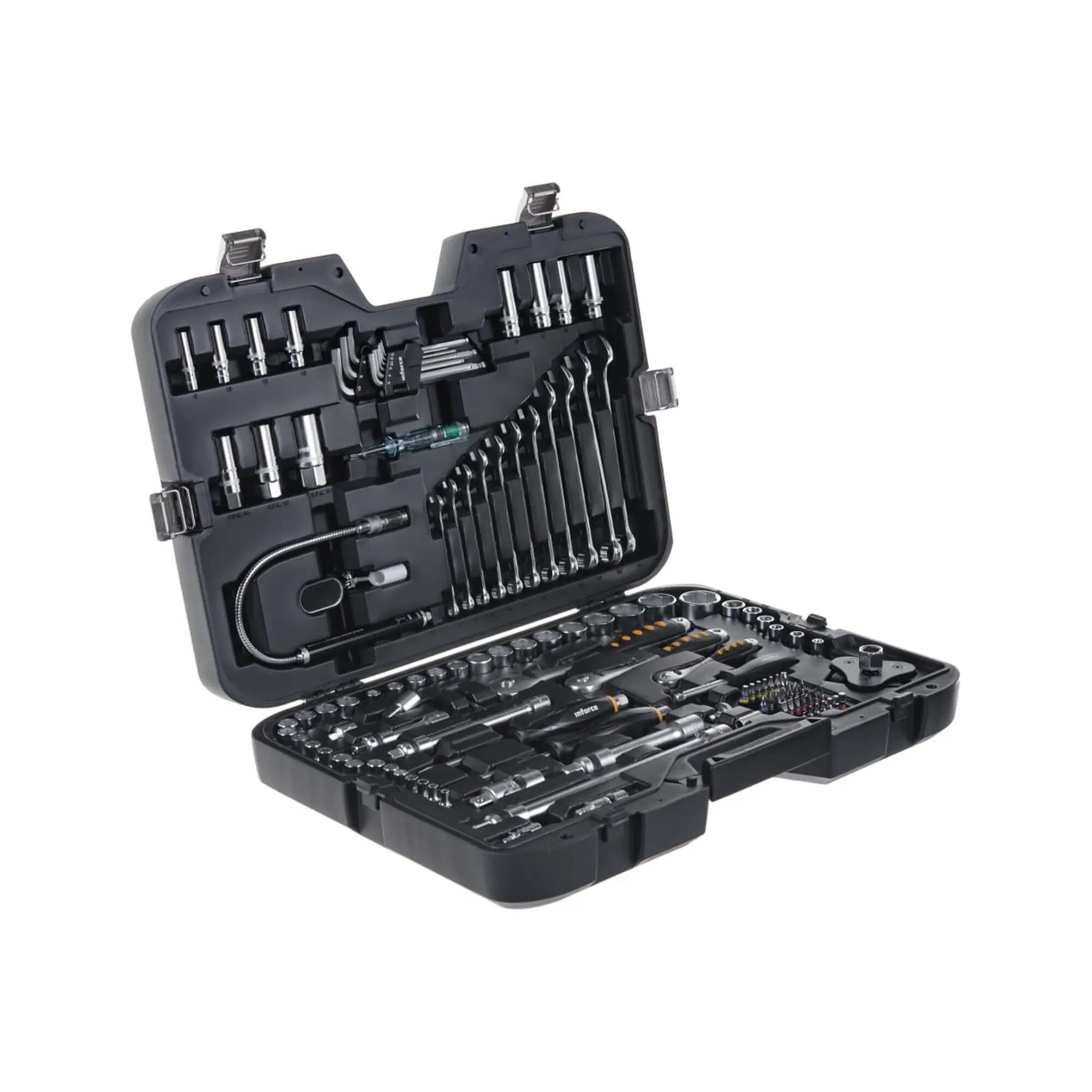 | Дополнительная информация | комплектация: 1/4" торцевые головки ; 3/8" торцевые головки ; 1/2" торцевые головки; 1/4" удлиненные торцевые головки; 1/2" удлиненные торцевые головки.; 1/2" головки Е-типа; 3/8" свечные головки с магнитом; 1/2" свечная головка с магнитом; 1/4"; 1/2" и 3/8" карданные шарниры - 3; 3/8" удлинители для головок – 100 и 175 мм - 2; 1/2" Удлинители для головок – 155 и 280 мм - 2; 1/4"M – 3/8"F адаптер; 1/2"М – 3/8"F адаптер; 1/4" адаптер для бит - 3; набор бит в пластиковом держателе; 1/4"F×1/4"M диск; 1/4" отвертка-держатель – 150 мм; 1/4" трещоточный ключ – 72 зубца; 3/8" трещоточный ключ – 72 зубца; 1/2" трещоточный ключ – 72 зубца; набор шестигранных ключей; набор имбусовых шестигранных ключей с держателем; комбинированные ключи; ударные отвертки; телескопическая рукоятка с зеркалом; отвертка-тестер; универсальный съемник масляных фильтров; кейс |