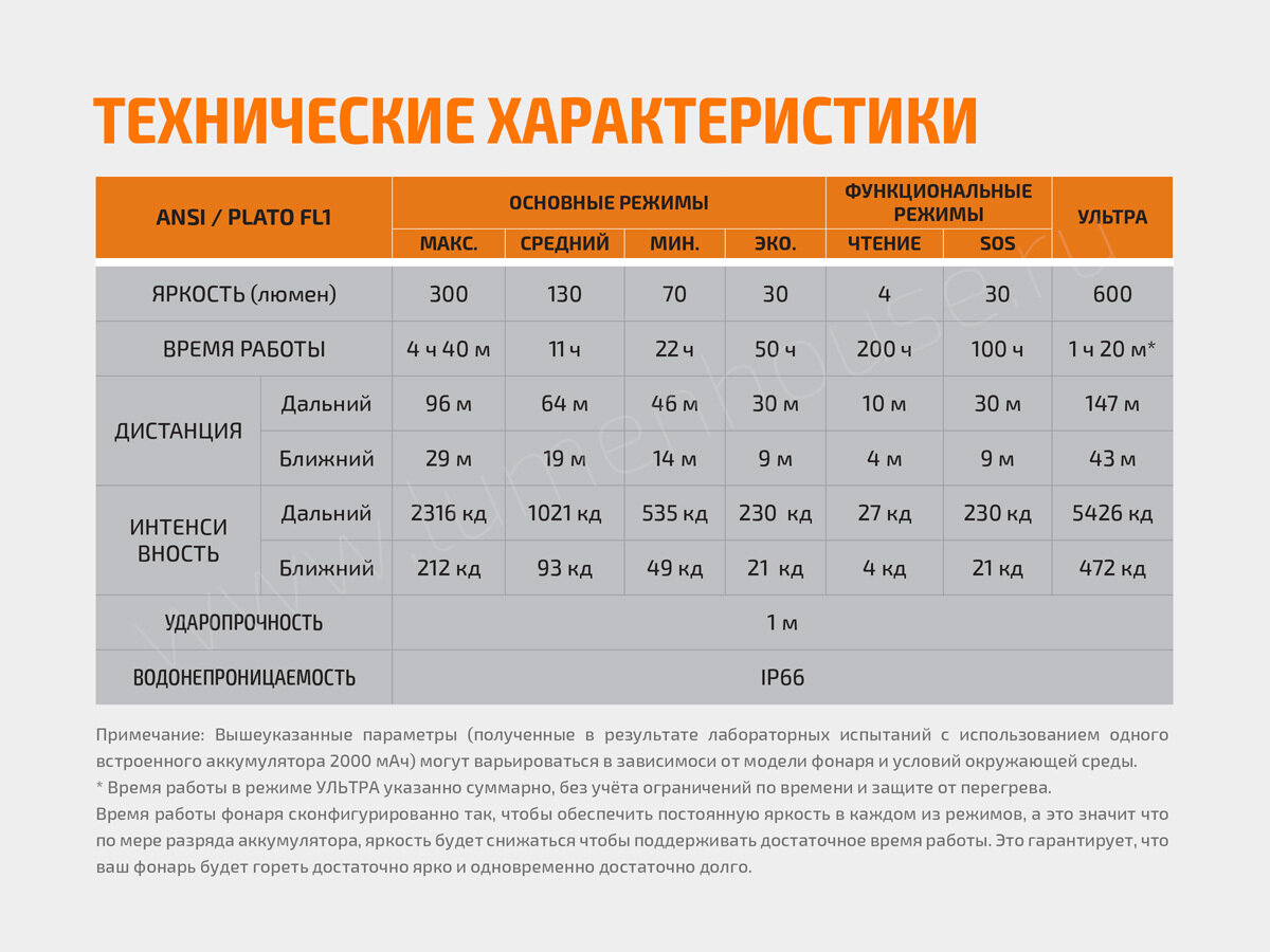 | Режимы | SOS / Максимальный / Минимальный / Режим вспышек / Эко / Средний / Чтение |