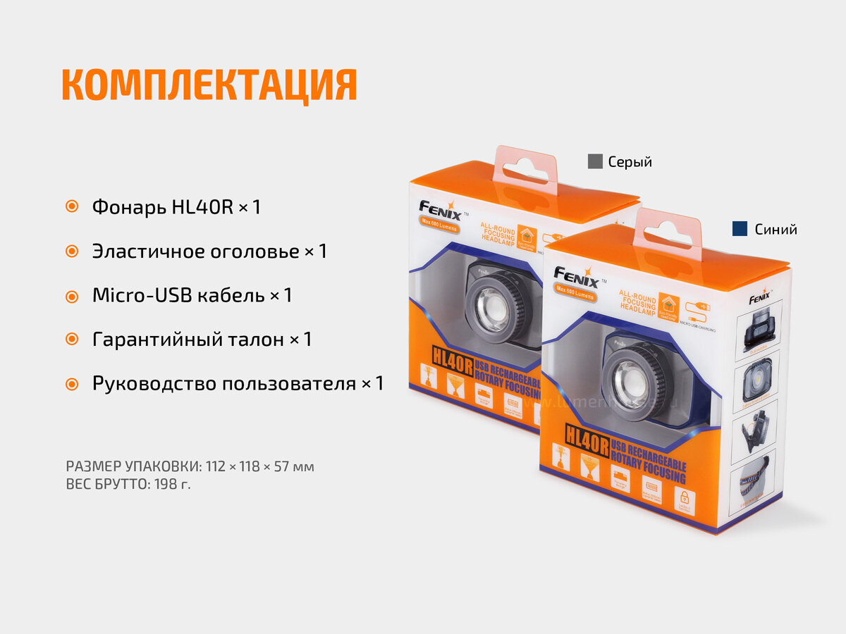 | Дополнительная информация | Гарантия: Два года гарантии дается на все фонари Fenix HL40R со встроенным аккумулятором. * Оригинальные комплектующие, которые мы используем в ремонте, поставляются со складов производителей, поэтому сроки ремонта зависят от наличия запчастей и сроков доставки у поставщика |
