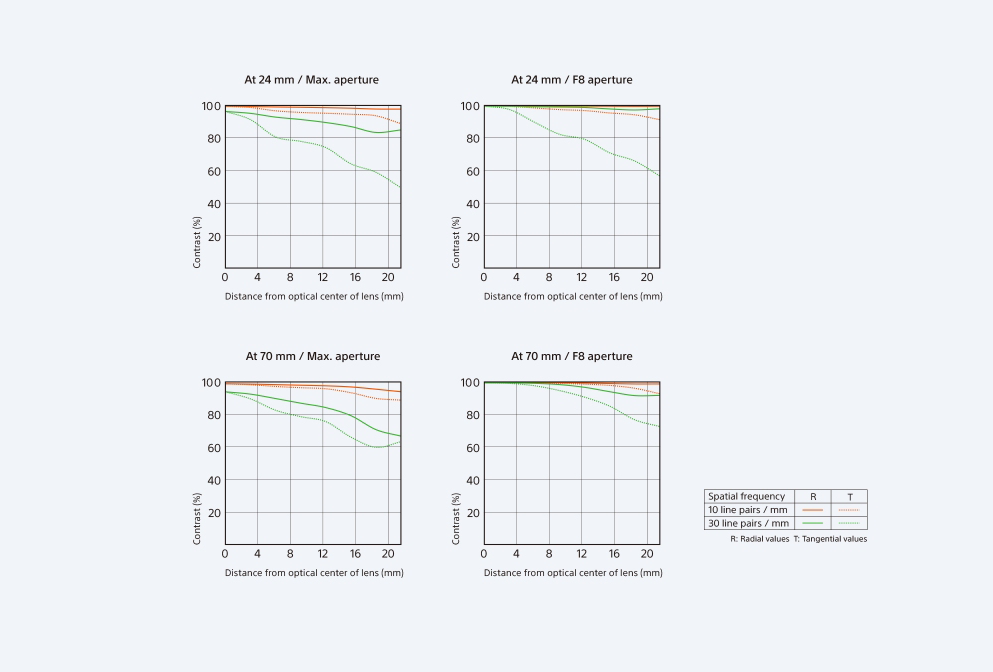 Дисторсия выше чем на FE 24–105 мм F4 G OSS Угол обзора на 24 мм меньше чем на FE 24–105 мм F4 G OSS |